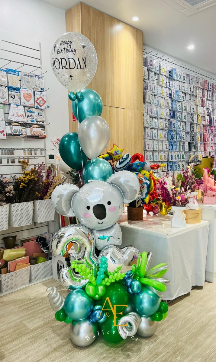 5 heliums with balloon printed (“Happy Birthday JORDAN”)