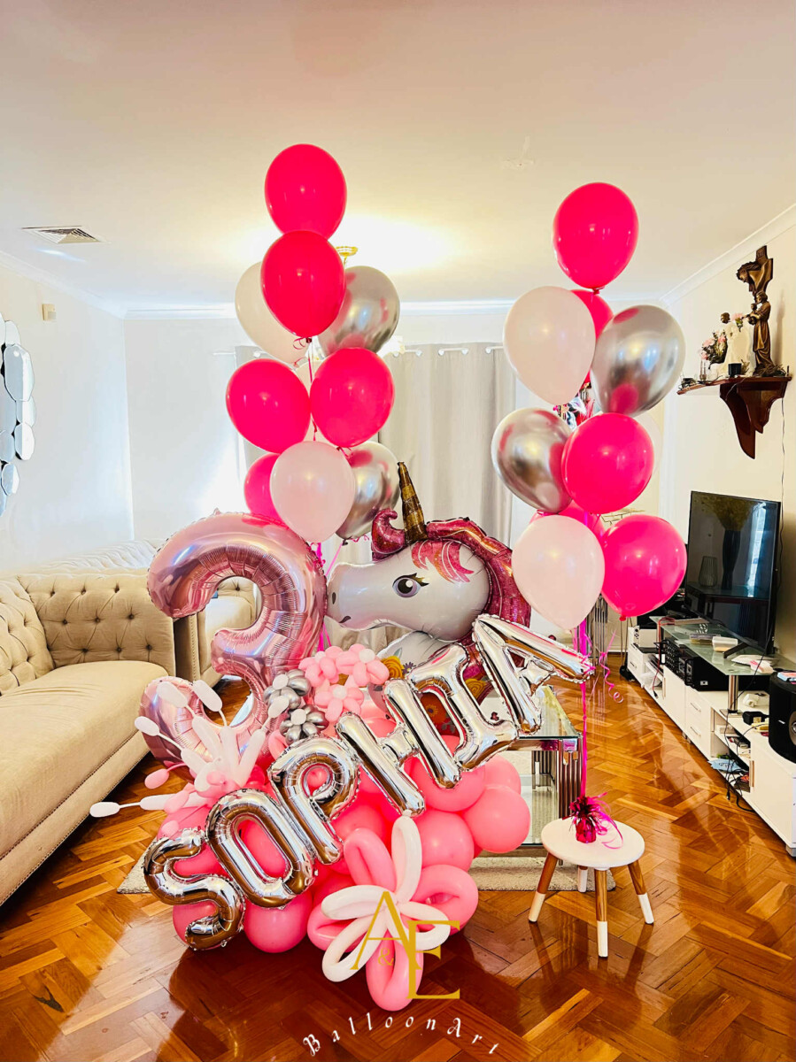 Bright pink & silver design featuring number “3”, unicorn foil balloon, flower balloons, and name letters. Perfect for girls’ birthdays! 💖 Helium & air-filled mix | Custom name available