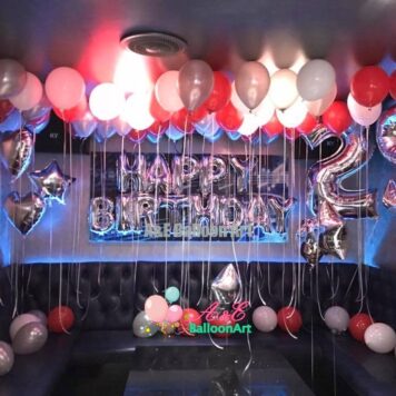 - 5 bunch helium balloon behind the chair.(7 helium balloons each bunch).