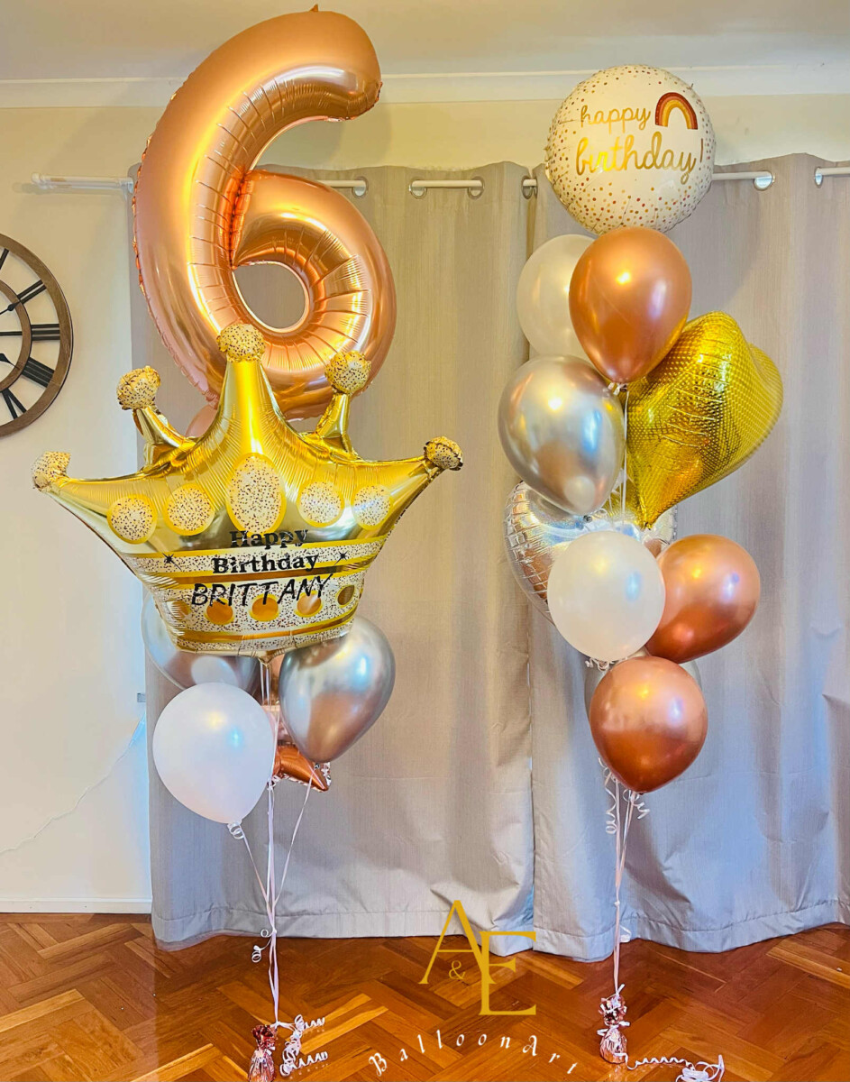 Luxury birthday set with number foil balloon and gold crown, finished with matching helium balloons.