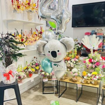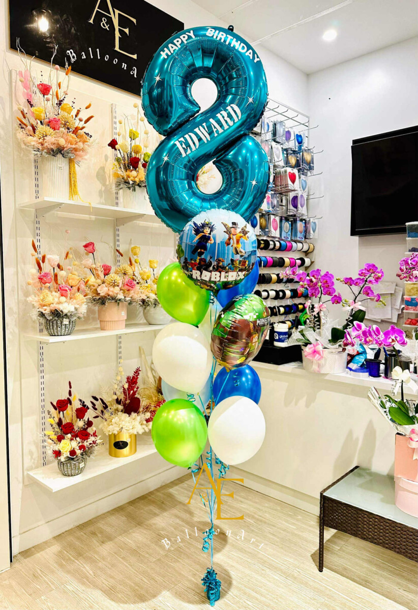 Teal โ8โ number balloon with Roblox and Minecraft foils, blue-green-white mix.๐ฎ Perfect for game loversโ birthdays!