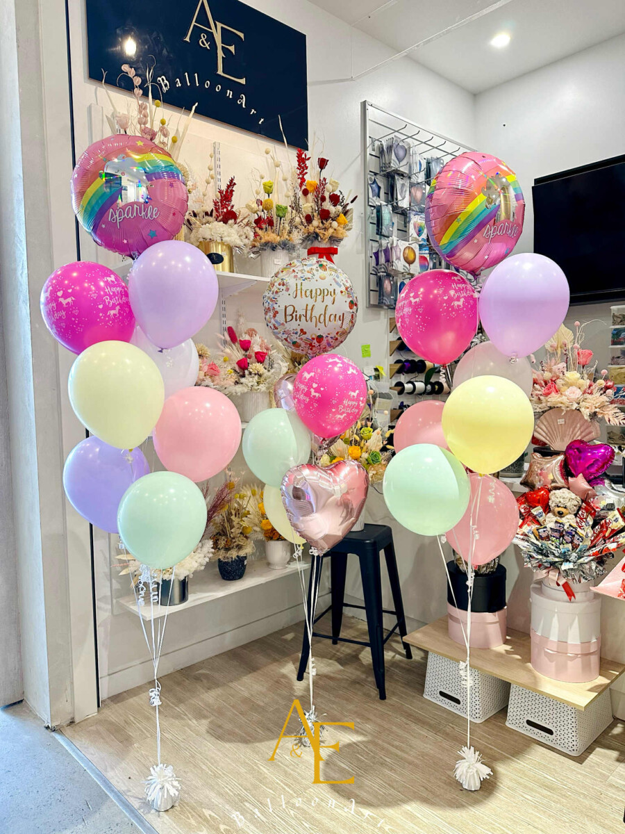 Includes “Happy Birthday” foil balloons and soft pastel clusters — perfect for kids and pastel lovers.