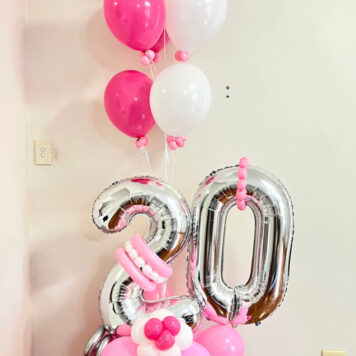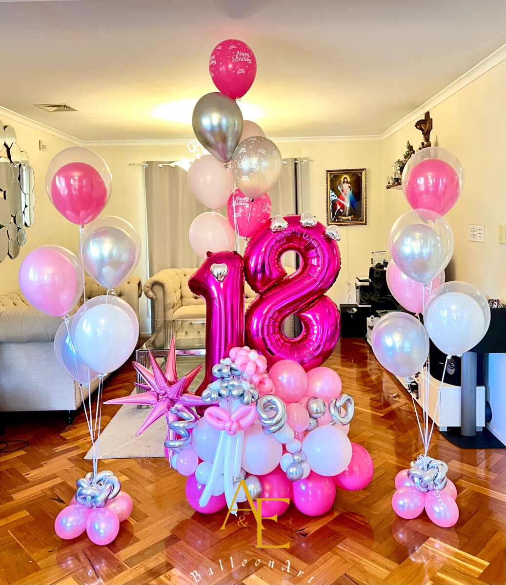 This setup includes number 18 in pink foil, chrome silver details, and matching pastel balloons.