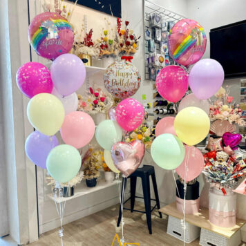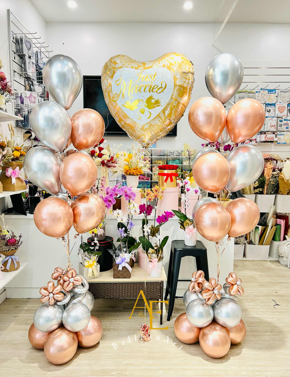 Features a large heart “Just Married” balloon in gold with chrome rose-gold & silver balloon bases on each side.