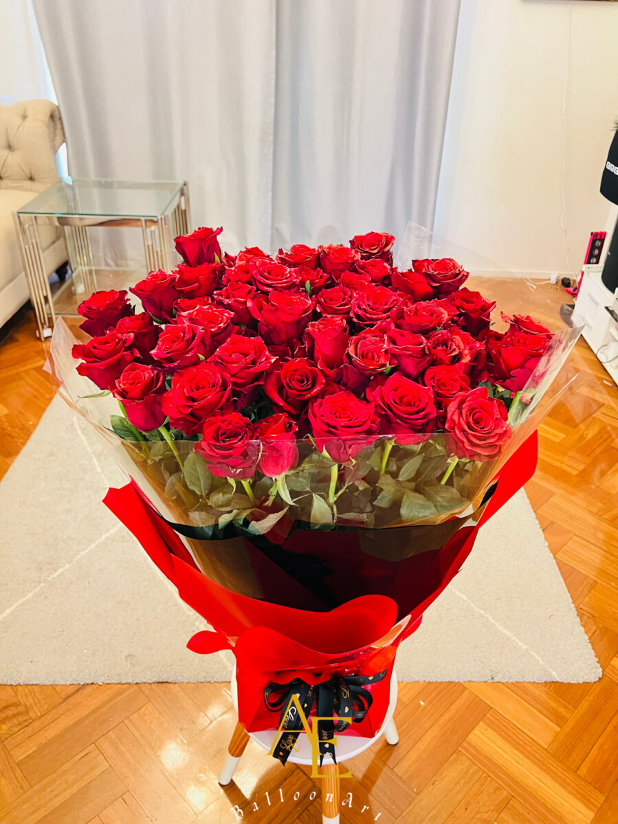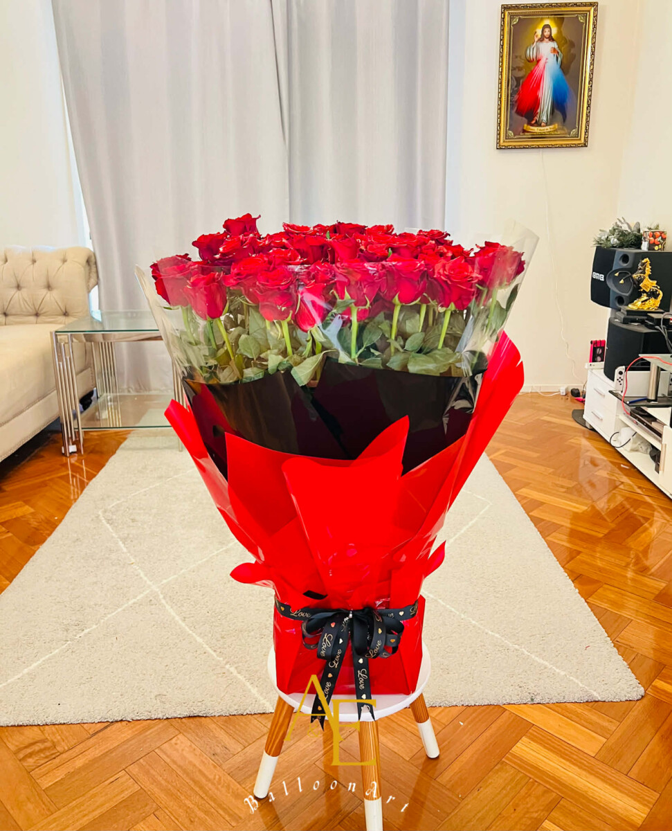 A breathtaking bouquet of premium long-stem red roses, beautifully wrapped in bold red and black luxury paper.