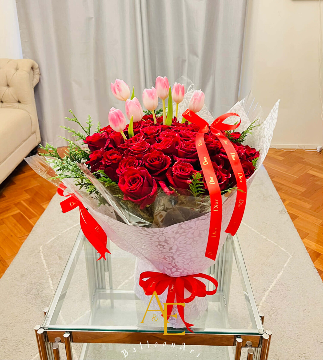 A luxurious arrangement of classic red roses paired with soft pink tulips for a modern romantic touch.