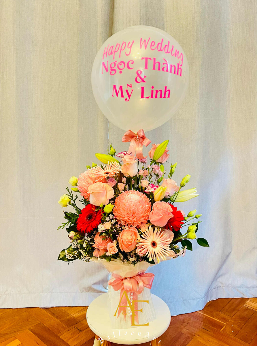 A stunning pink-themed arrangement with lilies, roses and mixed blooms, paired with a personalised wedding balloon. Ideal for receptions and wedding gifting.