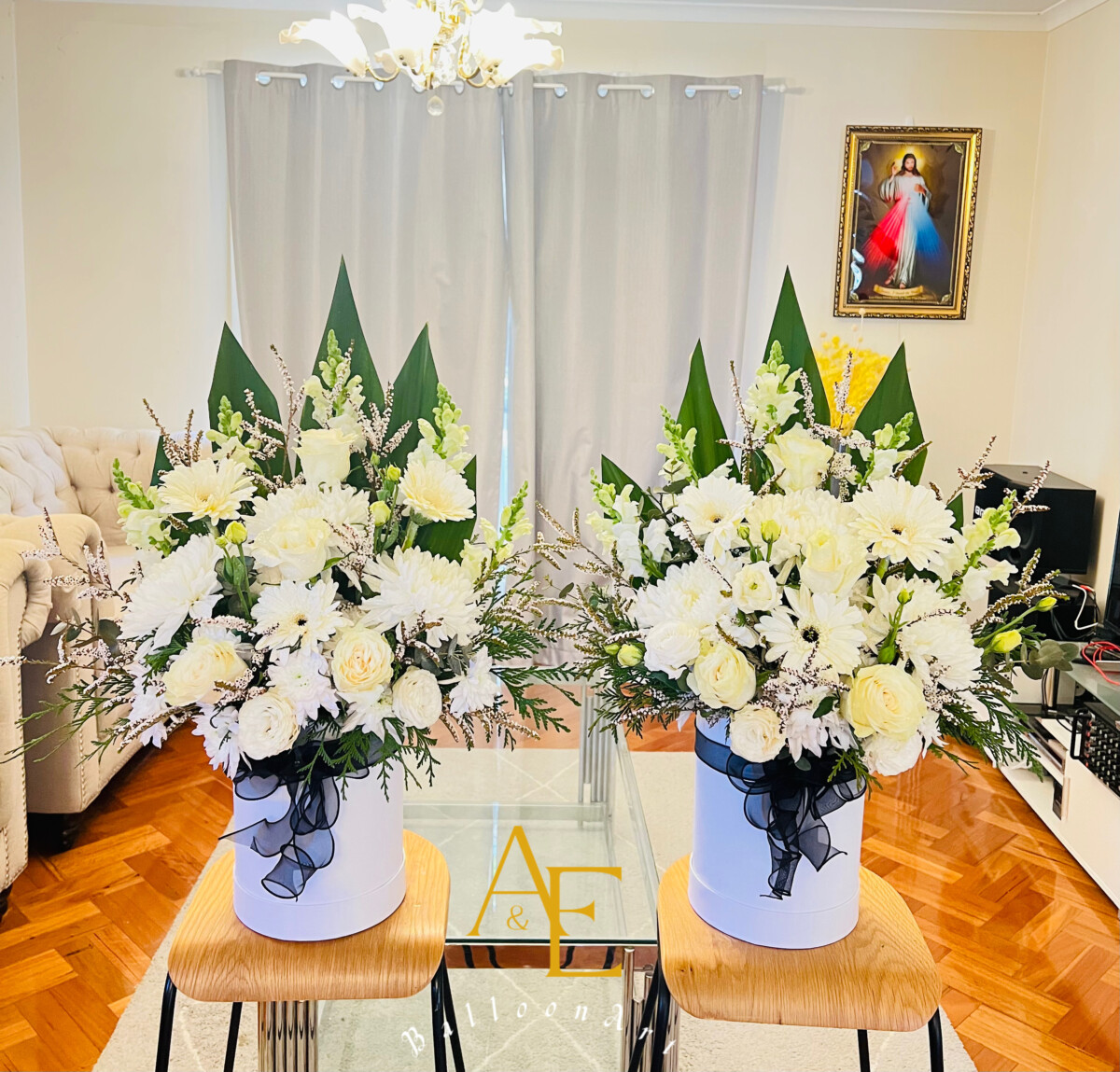 2 boxes Beautiful flowers arrrangement for funeral with full white color. It’s 70cm high.