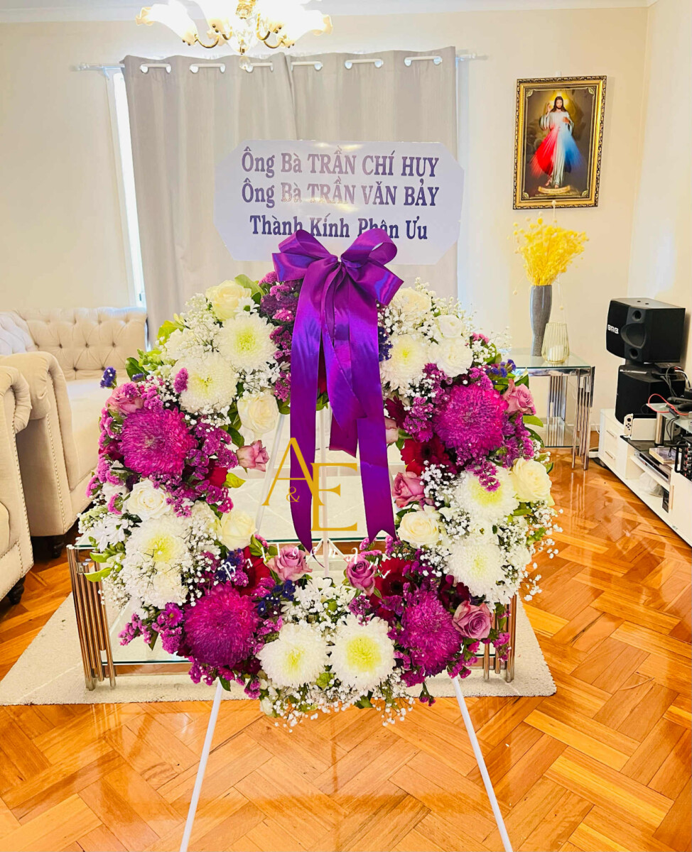 Purple represents dignity and remembrance, while white reflects peace and sincerity — a thoughtful expression of condolence and support during times of loss.