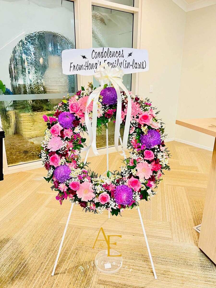 A wealth created form fresh flowers such as : roses , baby breath, chrysanthemums accented with greenery. These flowers are shipped fresh, budding and ready to bloom. Stand not included.