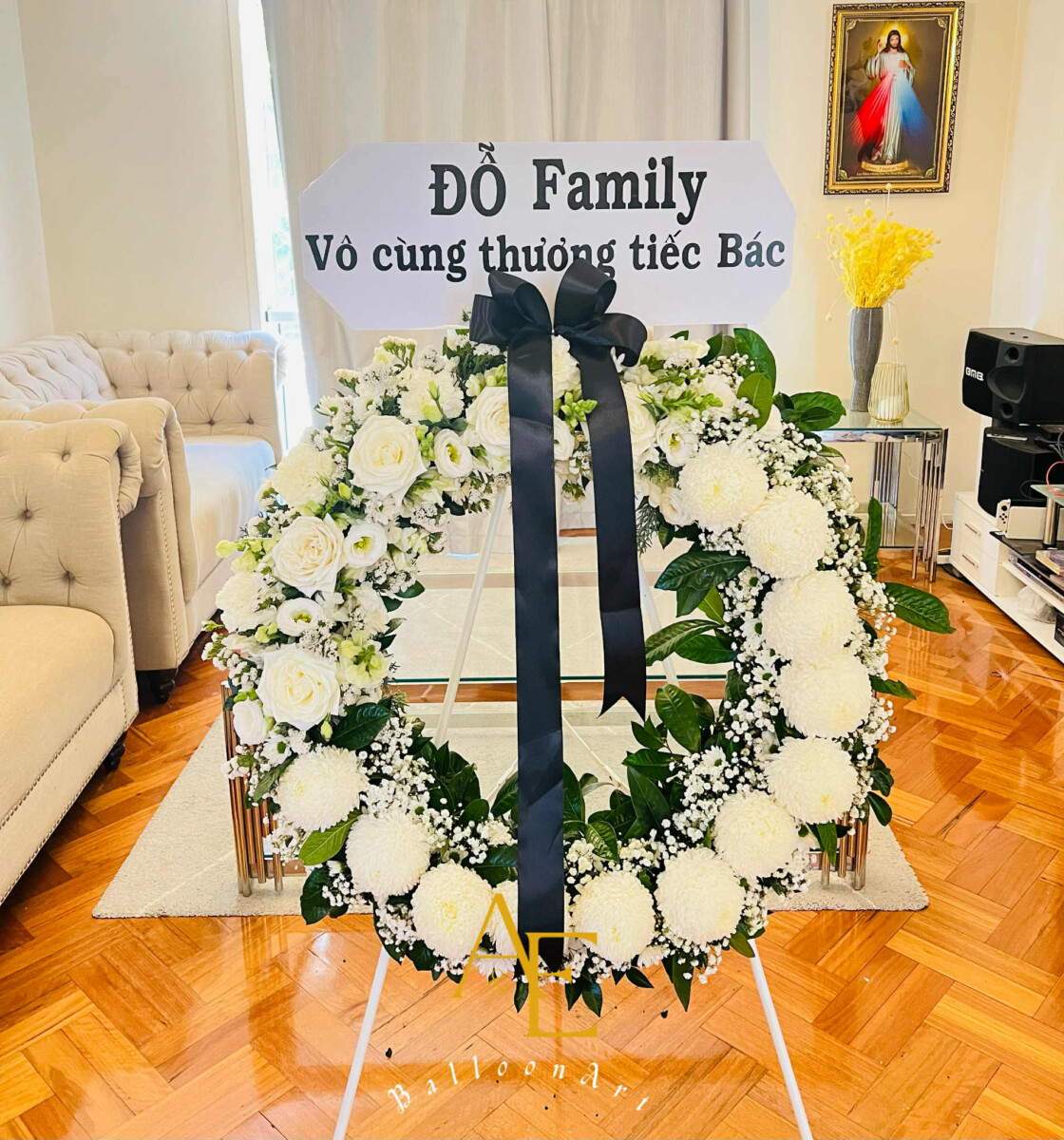 - A refined all-white sympathy wreath accented with a black ribbon, symbolizing mourning and eternal remembrance.