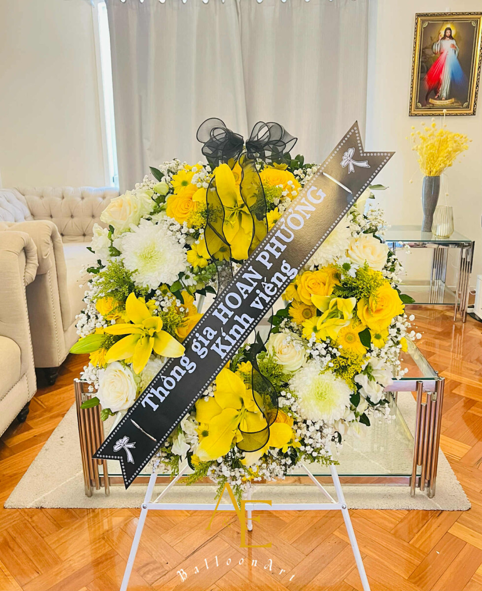 The combination of white and yellow symbolizes purity, remembrance, and heartfelt respect, making this arrangement a meaningful tribute to honor a loved one’s memory.