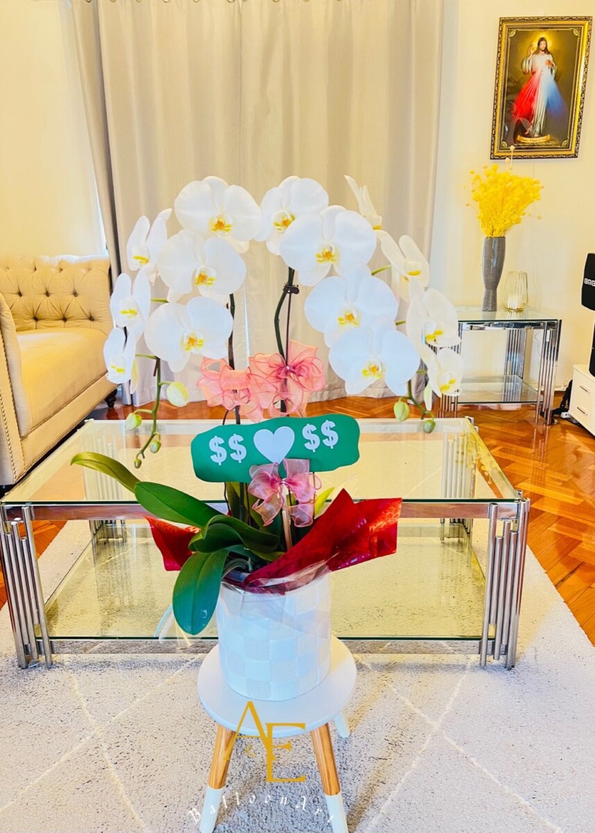 A stunning 2 stems white Phalaenopsis orchid designed to symbolize wealth, prosperity, and new beginnings โ a perfect gift for business owners, grand openings, or housewarmings.