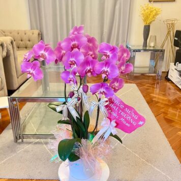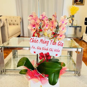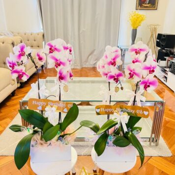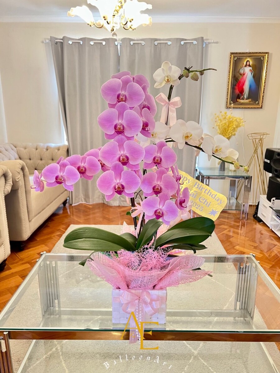 Each orchid stem blooms gracefully in shades of pink and white, beautifully arranged in a modern ceramic pot, enhanced with premium wrapping and satin ribbons. This piece radiates joy, success, and sophistication.