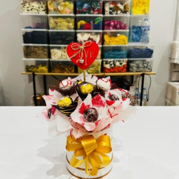 Beautiful large box with teddy bear combine with chocolate and wax flowers for Valentines’s Day.