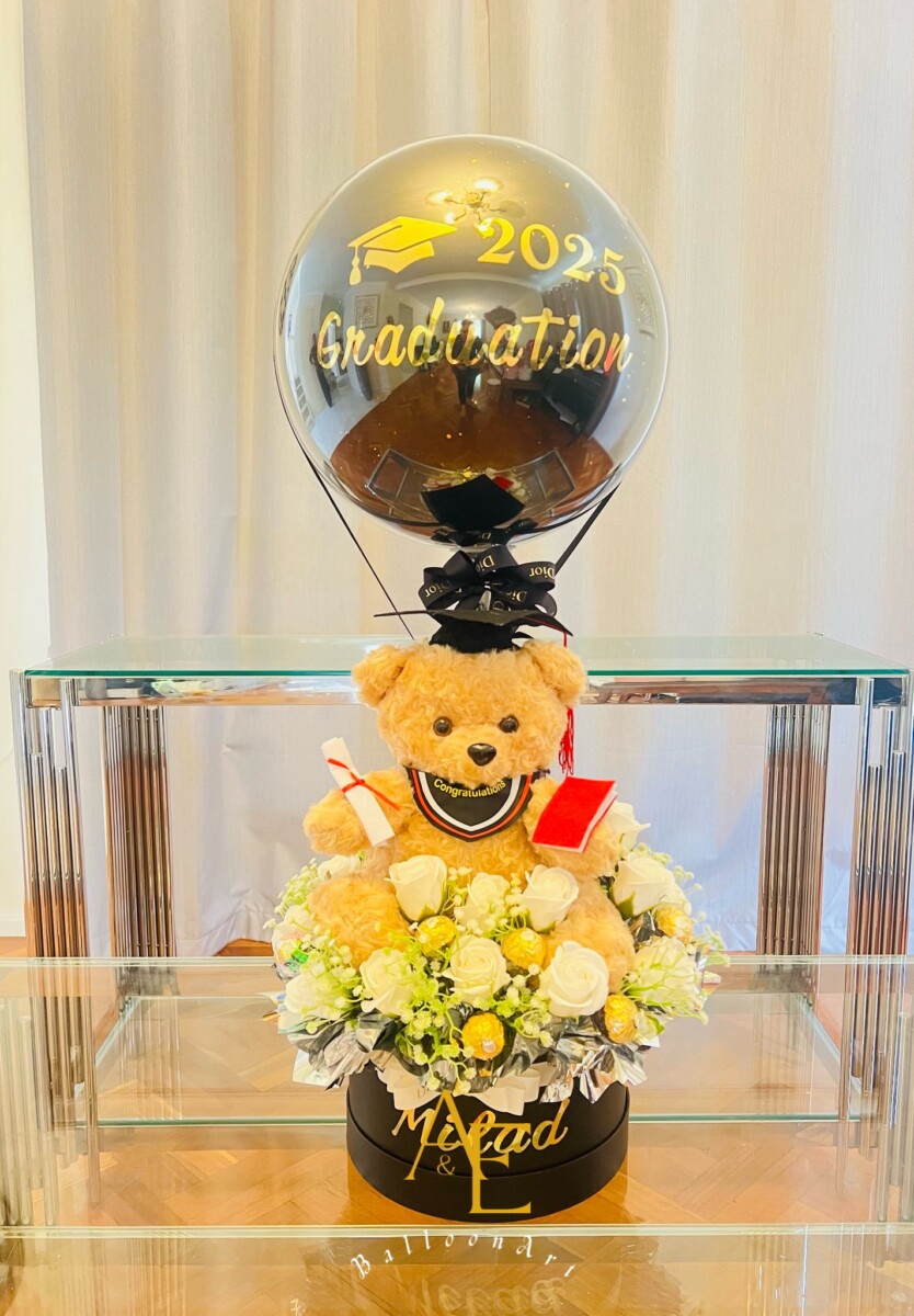 • A modern and elegant design featuring a personalised bubble balloon on top and a graduation teddy nestled in a bed of white–gold flowers.
