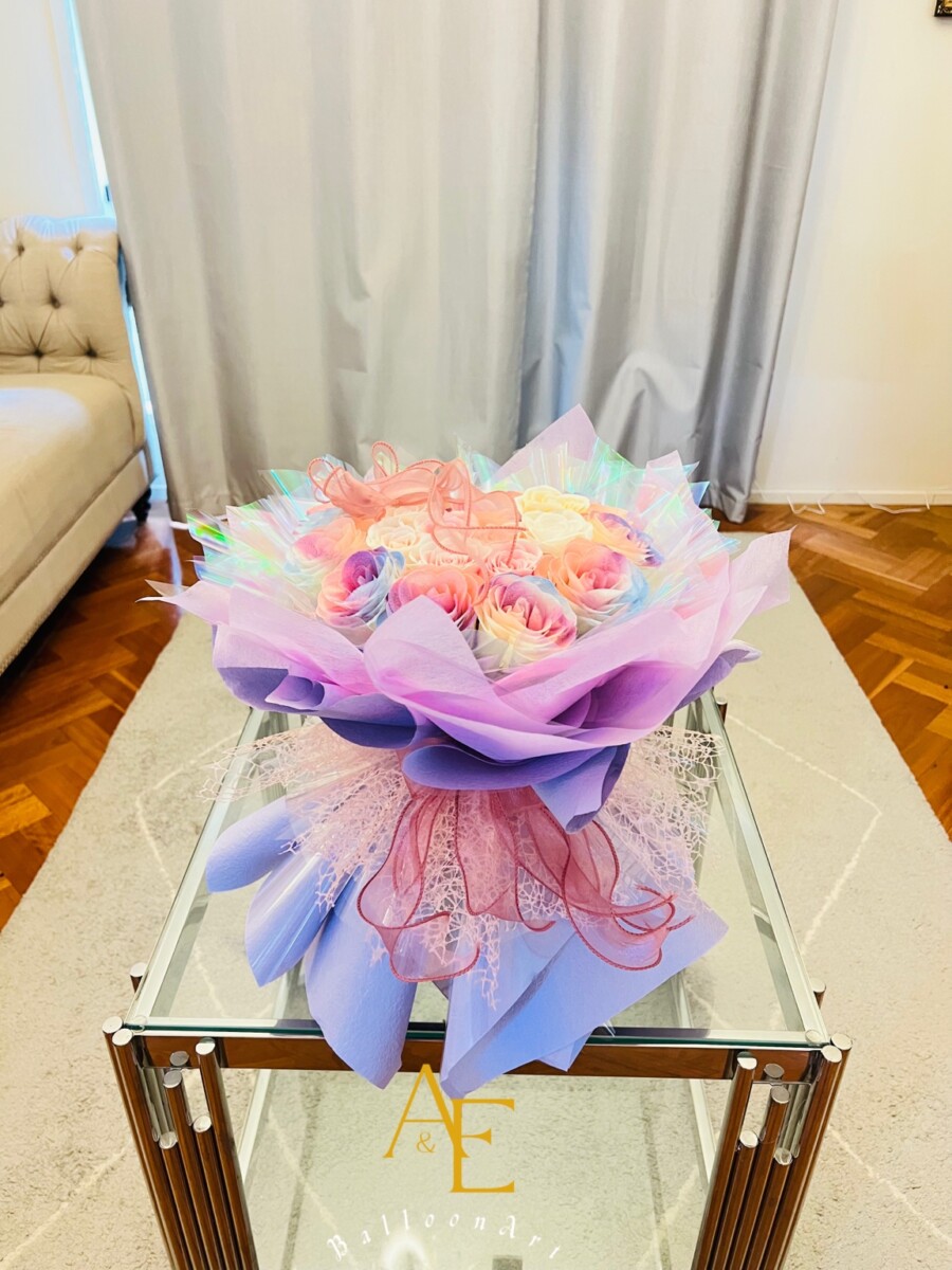 • A cute pastel bouquet with purple-pink wrapping – gentle, dreamy, and very “Valentines”.